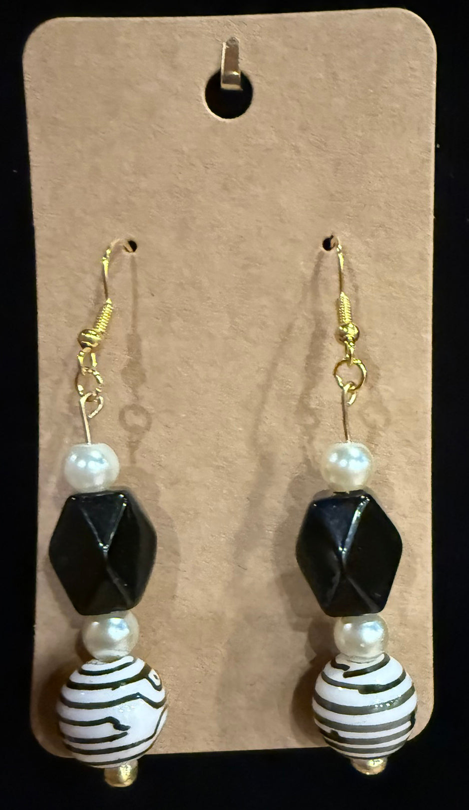 Striped black-and-white round beads, pearl accent, and faceted black bead for an artsy vibe.